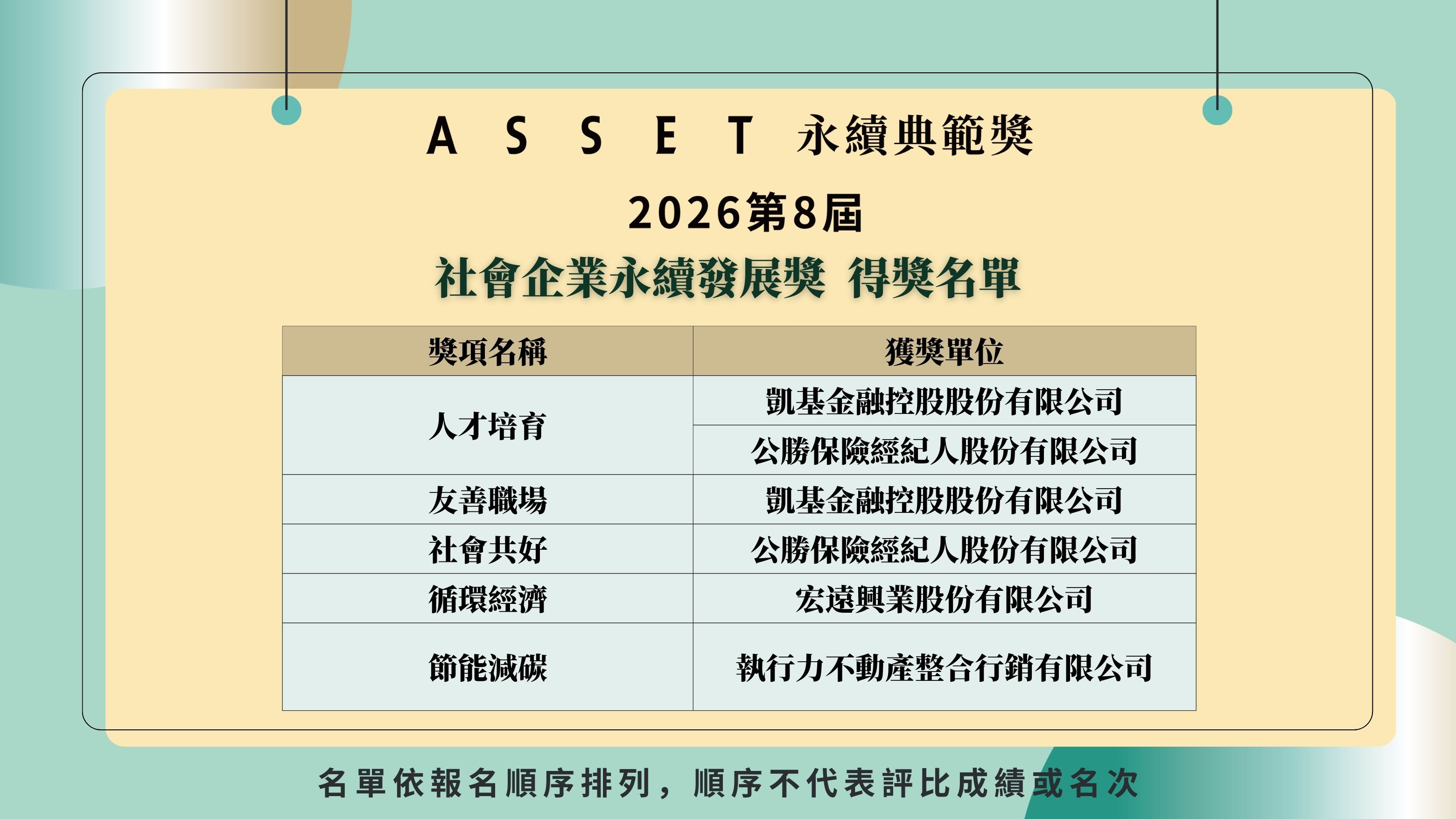 2026 第八屆 ASSET永續典範獎-【社會企業永續發展獎】得獎單位名單